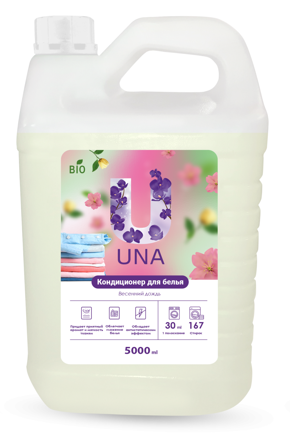 Кондиционер для белья UNA Весенний дождь. Идеально подходит для ручной и машинной стирки любых видов ткани. Придает белью мягкость и приятный аромат. Обладает антистатическим эффектом, после стирки облегчает процесс глажения.