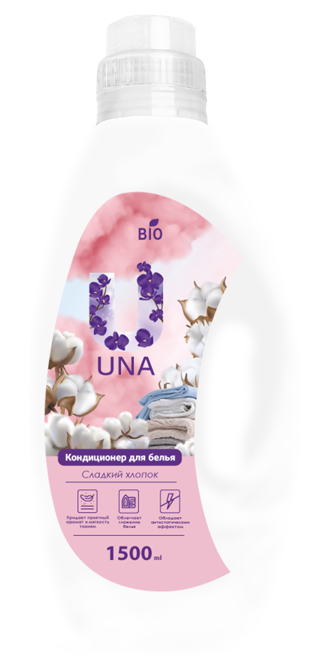 Кондиционер для белья UNA Сладкий хлопок. Идеально подходит для ручной и машинной стирки любых видов ткани. Придает белью мягкость и приятный аромат. Обладает антистатическим эффектом, после стирки облегчает процесс глажения.