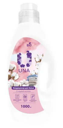 Кондиционер для белья UNA Сладкий хлопок. Идеально подходит для ручной и машинной стирки любых видов ткани. Придает белью мягкость и приятный аромат. Обладает антистатическим эффектом, после стирки облегчает процесс глажения.
