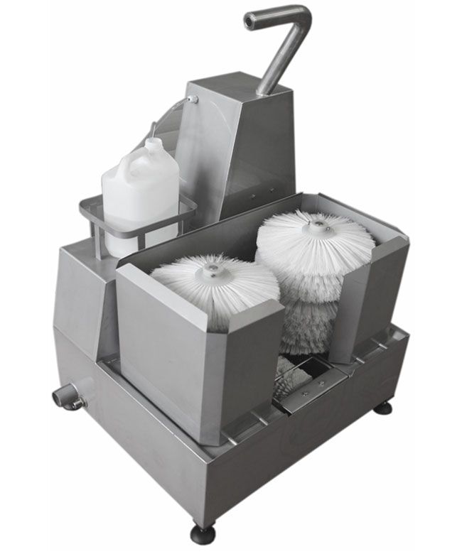 Автоматическая санитарная обработка подошв производственной обуви. Дезраствор на подошвы и голенища обуви поступает с вращающихся щеток, которые включаются автоматически после прикосновения человека к датчику установленному в торце поручня. Концентрация и поступление дезраствора поддерживается автоматически. Дезинфектор состоит из автоматического дозатора дезсредства, блока щеток с электроприводом и системы управления. Подключение к водопроводу G1/2". Электропитание: трехфазное подключение. Потребляемая мощность не более 1 кВт. Напряжение: 380 В, 50 Гц. Все элементы системы смонтированы на нержавеющей раме. Изготовлена из нержавеющей стали AISI 304.