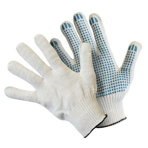 Натуральный материал. С точкой ПВХ. Высокая износостойкость. Средство для защиты рук, имеющее точечное ПВХ напыление на ладонной части. Способны защитить руки от производственных загрязнений, порезов, ссадин и тепловых ожогов. Перчатки с ПВХ нескользящие, высококачественные с сохранением тактильных свойств при сборке мелких деталей. Кожа рук дышит, благодаря неполному обливу перчатки и натуральной хлопковой пряже. Защищает от загрязнений и незначительных механических воздействий. Небольшая масса и лёгкость транспортировки. Высокое качество обработки манжеты (Х-нить). Дополнительная синтетическая нить придает эластичность и повышает износостойкость.