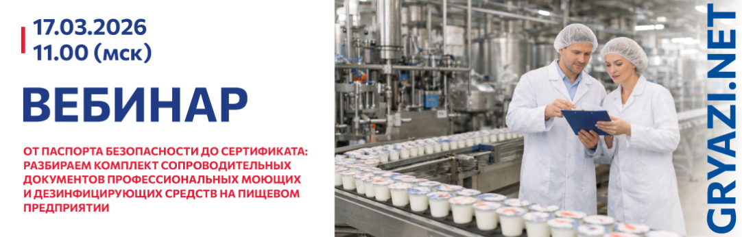 Вебинар 17.03.26 в 11.00: От паспорта безопасности до сертификата: разбираем комплект сопроводительных документов профессиональных моющих и дезинфицирующих средств на пищевом предприятии.